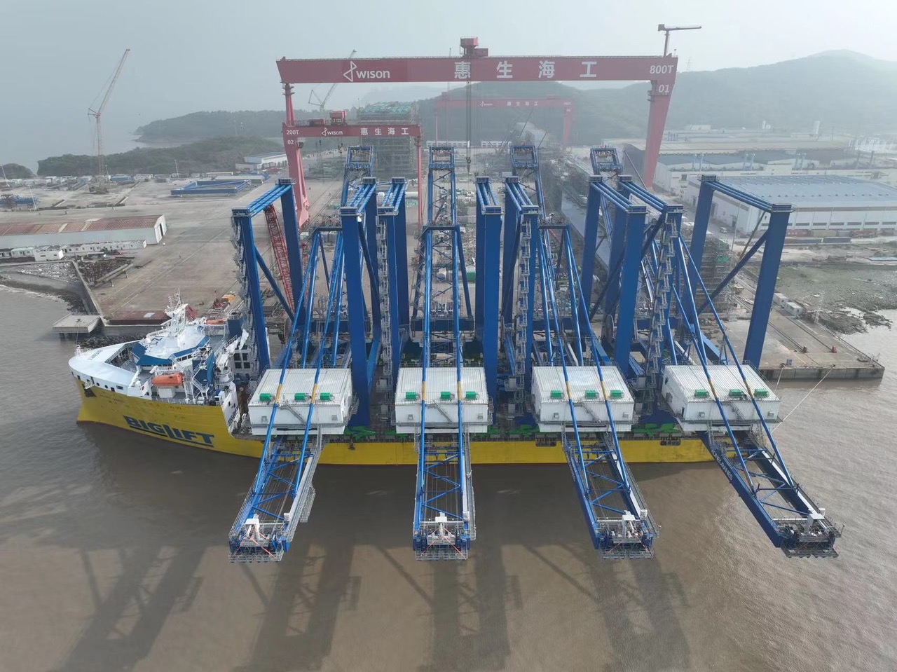 Caption: A set of four ship-to-shore container cranes loaded on a vessel ready for transport from China to the USA.