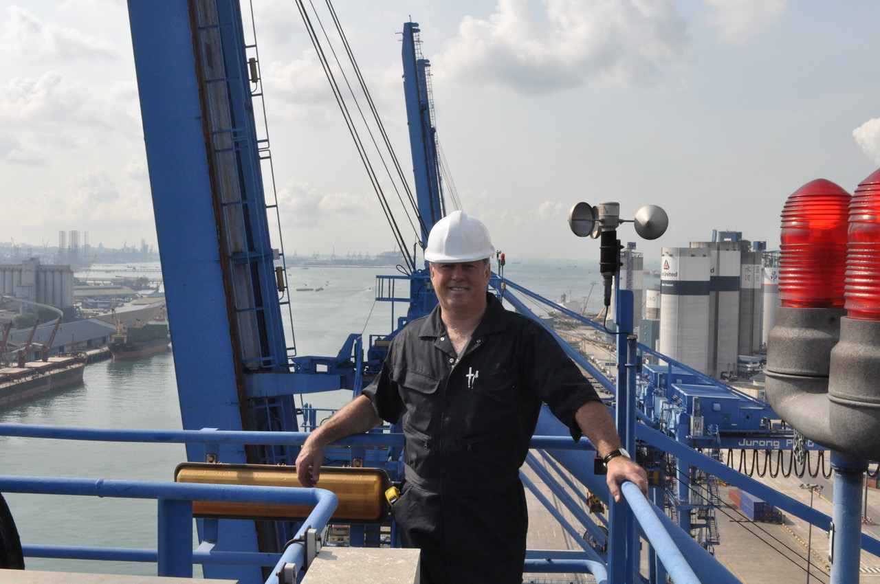 Caption: Industry stalwart: CP&A’s past president Rich W. Phillips on a container crane.