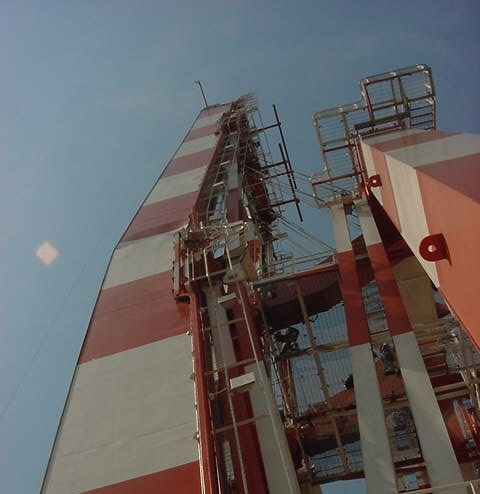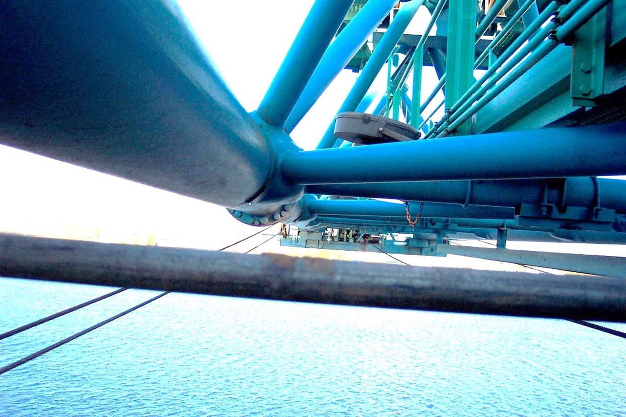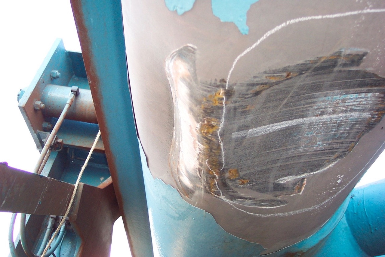 Caption: The bottom of a boom chord was damaged when it accidentally contacted the wheel house of a container vessel.