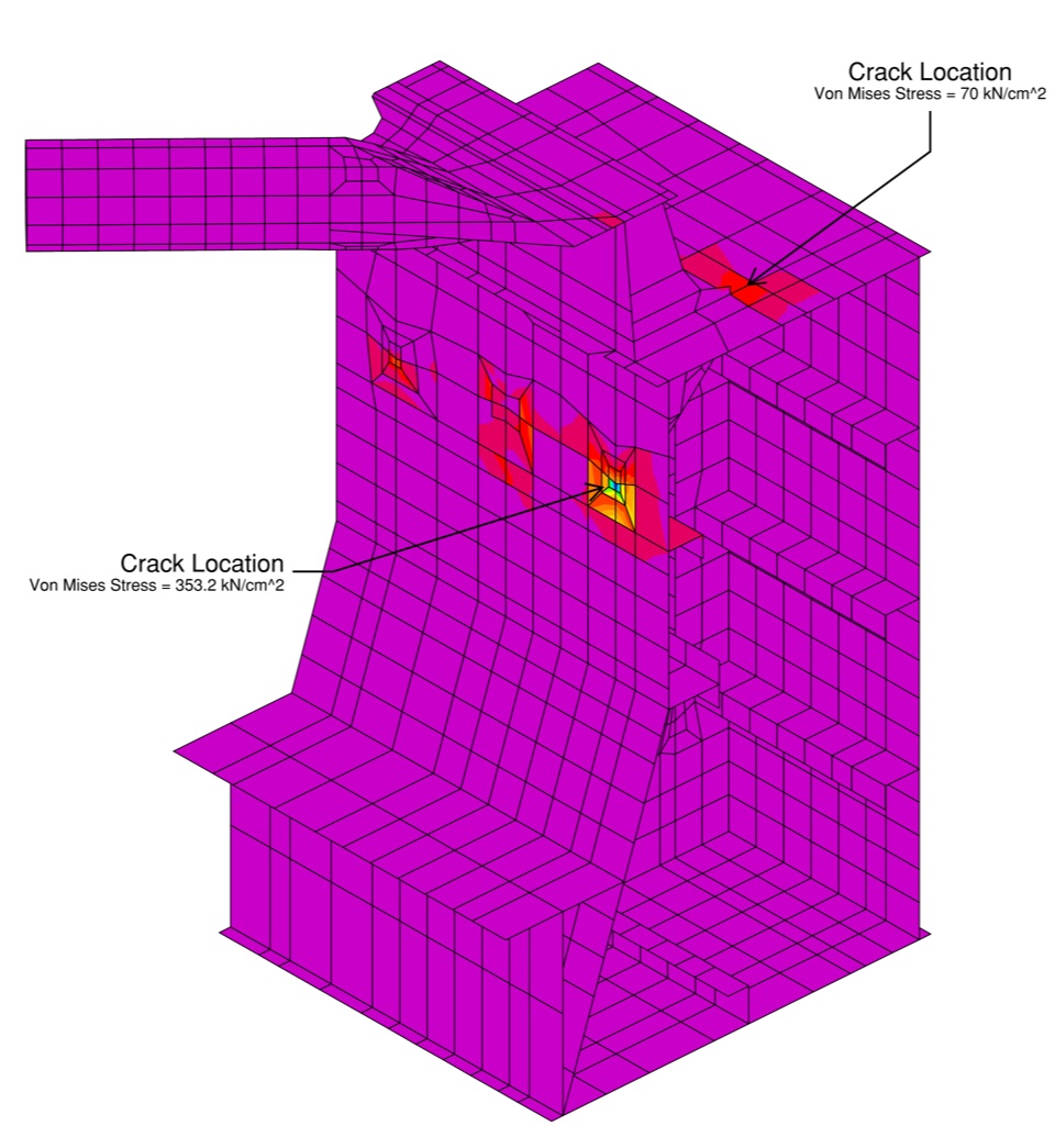 Caption: Finite element analysis model of boom brace connection on a container crane. Two cracks were discovered in this location.