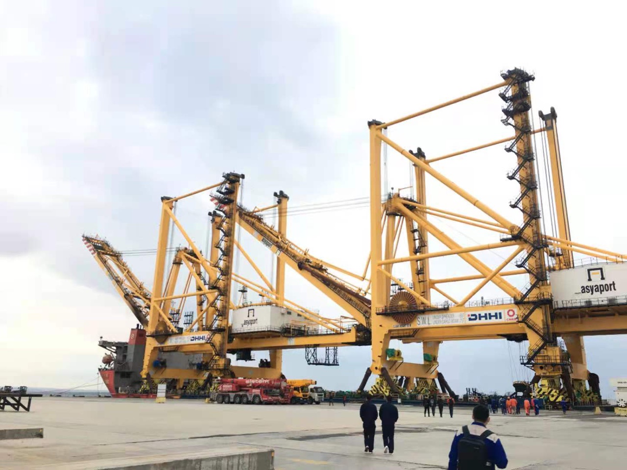 Caption: Three container cranes being shipped fully erect. Container cranes have kept up with vessel sizes by increasing their outreach, lift height, and even lift capacity.