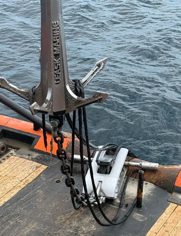 Caption: Close-up image of the Stingray attached to Leask Marine’s grapnel onboard the vessel.