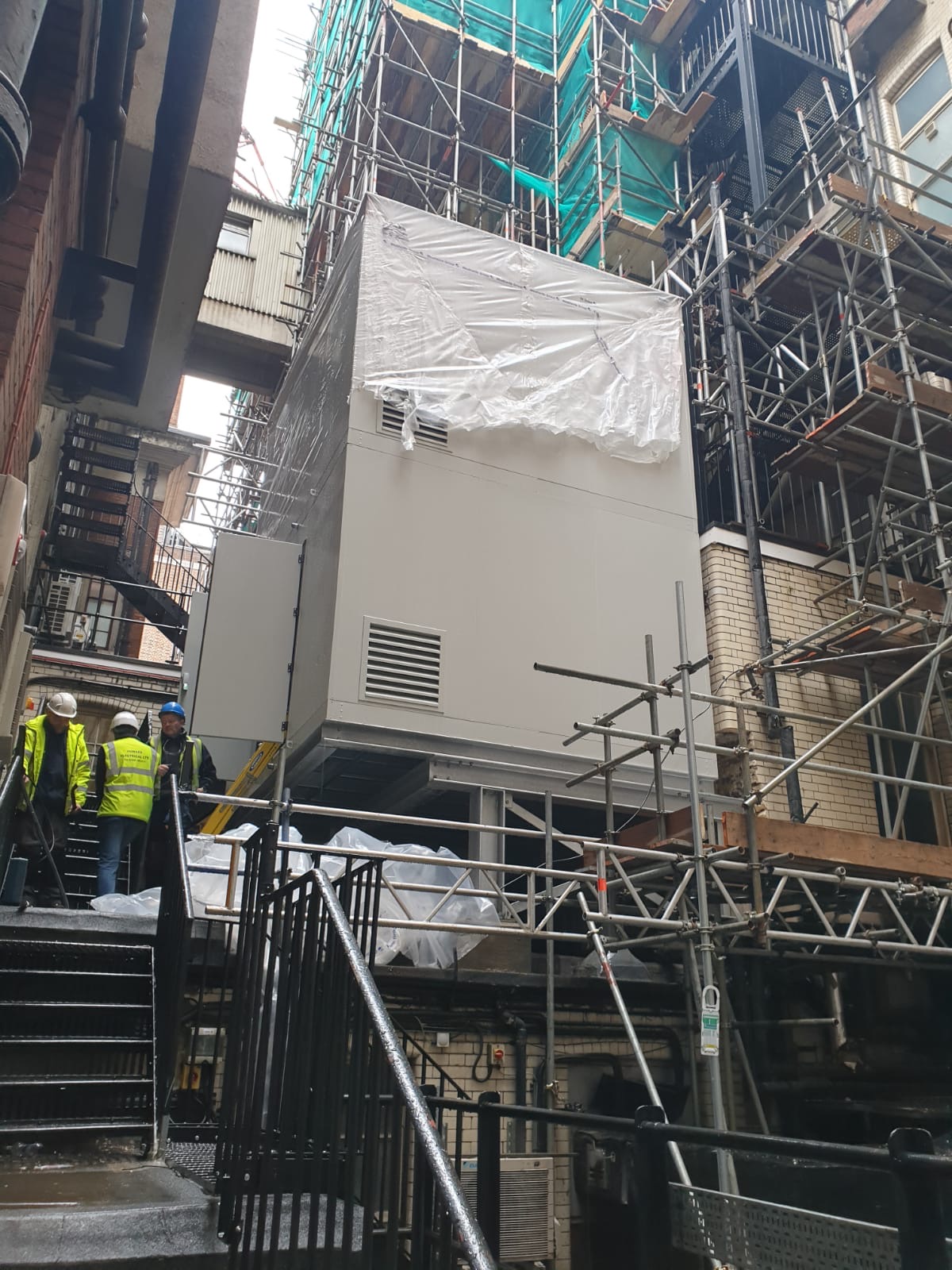 The two-story plantroom was delivered on two wide-load lorries out of business hours to ensure traffic was at its quietest on busy surrounding London roads. On a Saturday, the plantrooms were crane lifted over the building and lowered into position within the courtyard area.