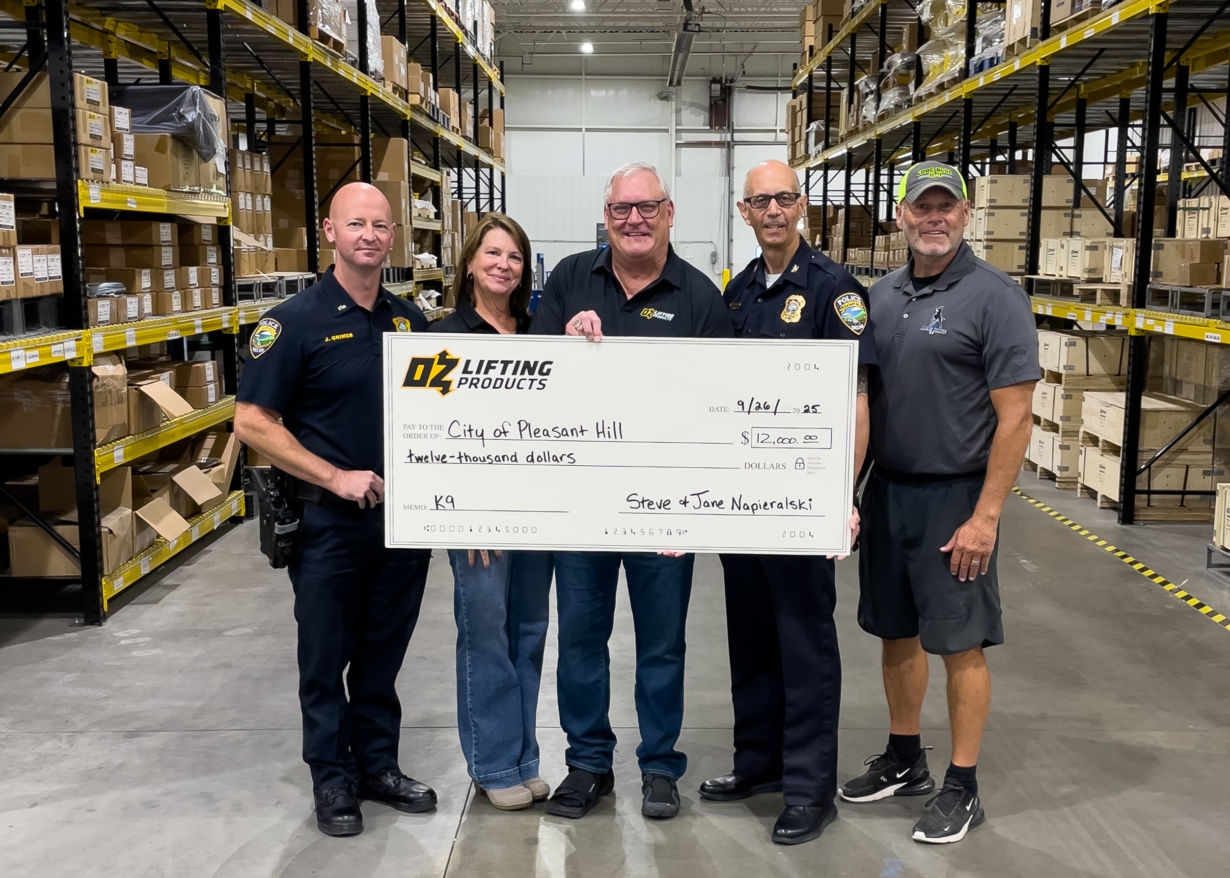 When Shawn Hoffman, a Pleasant Hill Officer, takes delivery of the dog, it will be trained in narcotics detection; patrol work; building and article search; tracking; criminal apprehension; and vehicle searches. Trace Erickson, a former law enforcement officer, leads 13-week training programs — even utilizing an out-building on the property of OZ Lifting’s new 40,000 square-foot facility.