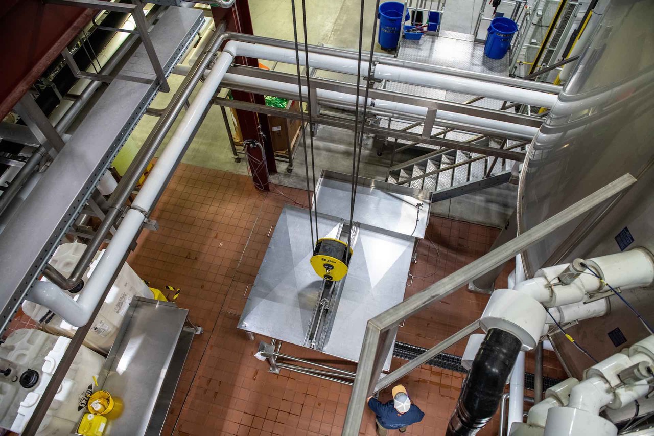 Founders designed and commissioned the fabrication of its own vessel specifically for the task of dry hopping. This vessel holds around 1200 lbs of hop pellets that are tipped into beer. The company needed a crane that could easily lift and position the vessel, enabling Founders to dump the hops into the beer tank. The crane also needed the capacity to periodically move giant stainless-steel tanks to enable cleaning and other maintenance tasks, such as overhauls for the centrifuge and lifting items to upper-level storage.