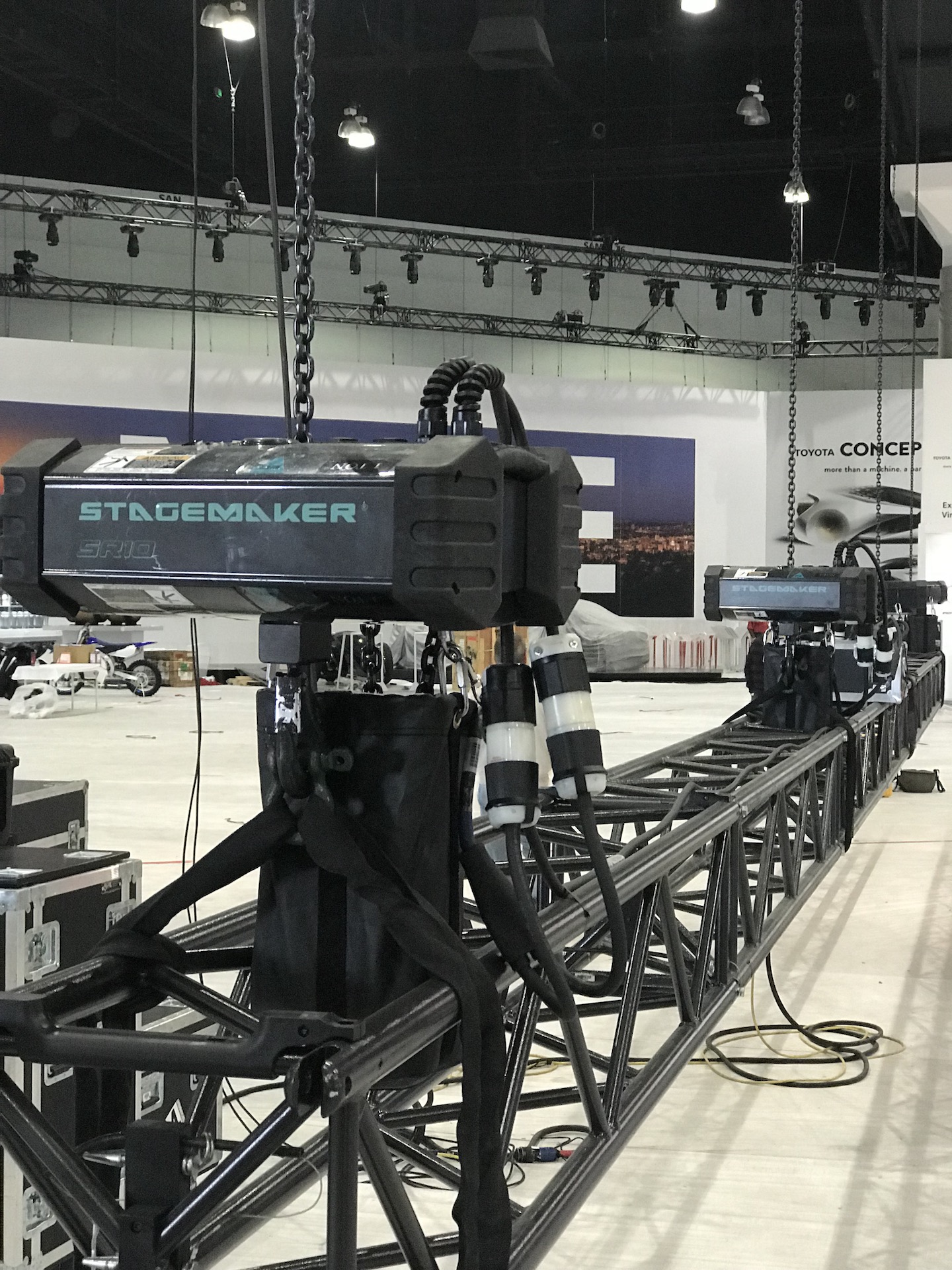 Over 100 hoists were used in total—57 this year, 56 last—the majority of which were Stagemakers, ranging from ¼ to 2-ton capacity. Yeo highlighted the fact that all of the hoists ran at 16 ft. per min, while the length of the chains was typically 60 ft. or 80 ft. There were varying trim heights for the rig; the lowest was 16 ft. and the audio hangs usually trimmed to 60 ft. The lighting trusses’ maximum trim was 45 ft., Yeo added. Lighting trusses usually had three or four hoists moving at once and the audio main hangs had three hoists working together. The side hangs, meanwhile, had two pick-points that worked in tandem.