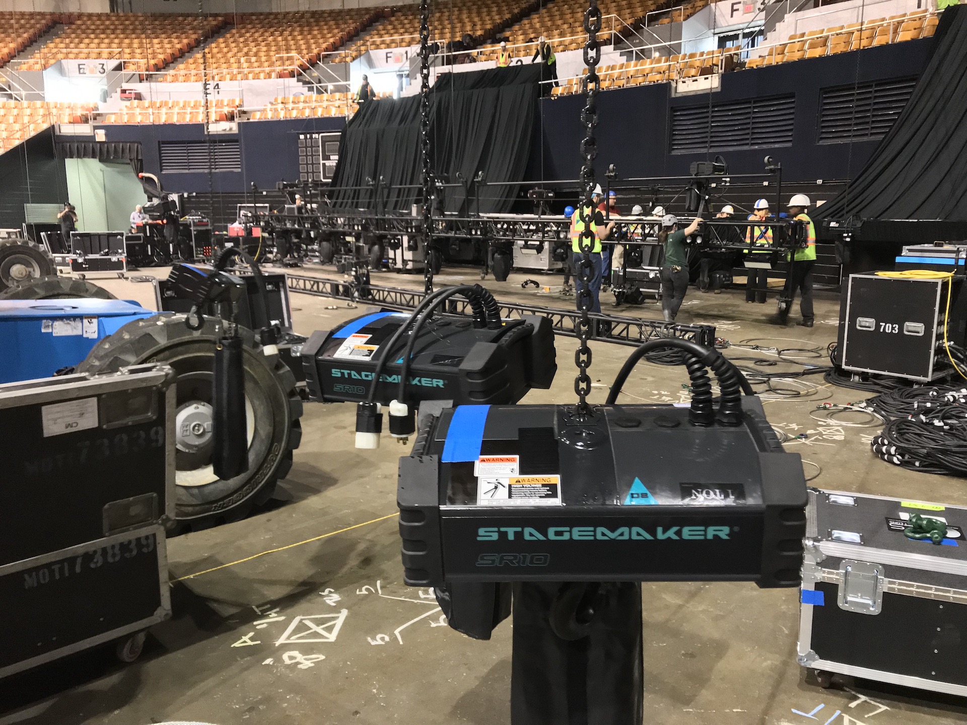 Pre-rigging is when the tour rigger and local riggers go in earlier than the rest of the equipment and tour personnel to hang all of the motors. Sometimes this is done a day before or a few hours in advance of the main load-in. In this case, the team chose to pre-rig due to time restraints in getting the show loaded with added elements that hadn’t been on the tour previously.