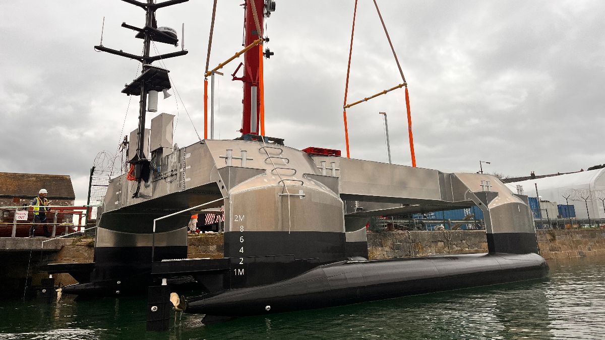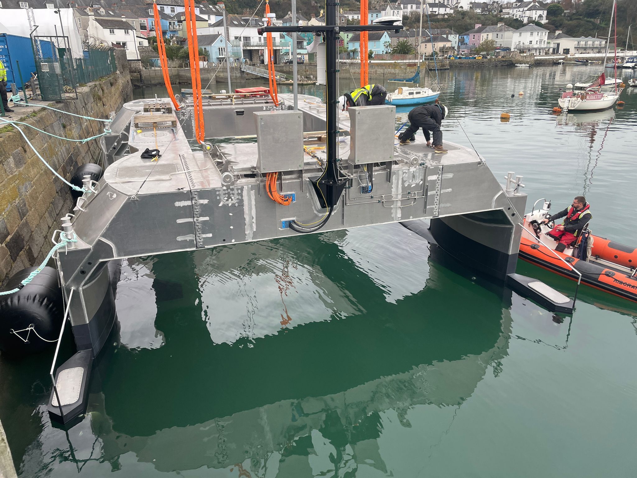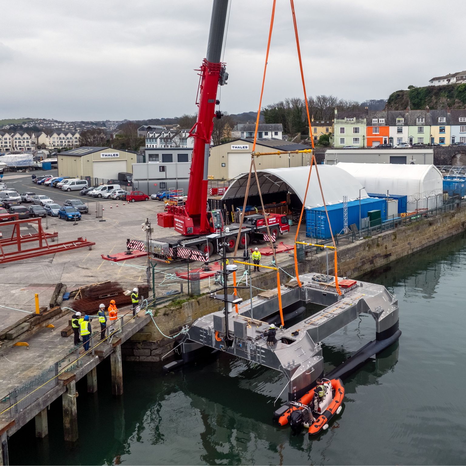 Caption: USV-Pioneer was lowered into water at Turnchapel Wharf, Plymouth.