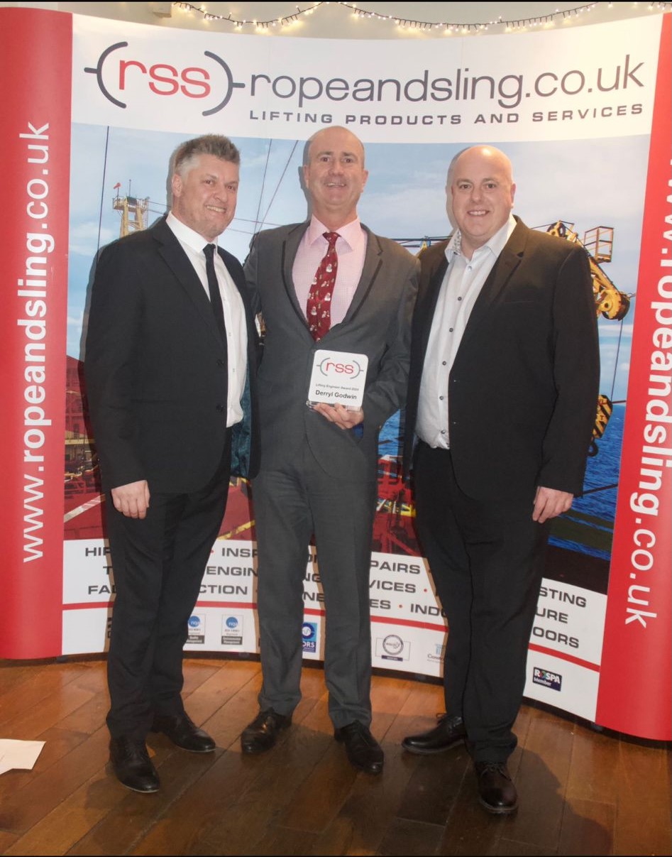 Caption: Derryl Godwin (centre), Lifting Engineer winner, with Steve Hutin (left) and Alan Varney.