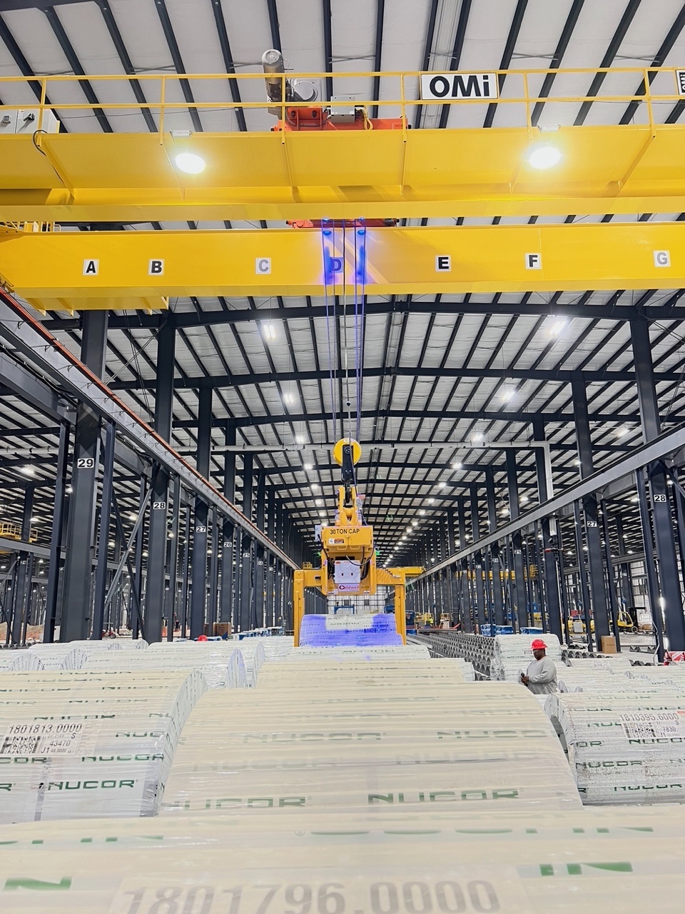 The fleet of material handling equipment will operate below-the-hook of 14 32.5-ton capacity double girder electric overhead traveling (EOT) cranes, manufactured by OMi Crane Systems Inc., installed by Simmers Crane. Also included in the order was parking stands to facilitate storage of the coil grabs when not in use. All overhead lifting technology is operated by remote control. The facility will be fully operational later this year.