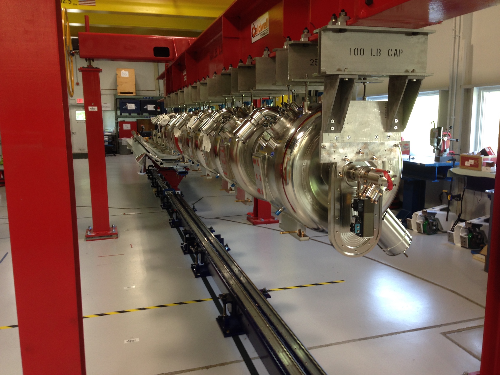 Caption: Cryomodules are positioned on a track directly beneath the beam/s and tooling is utilized to accurately position components beneath various lifting points.