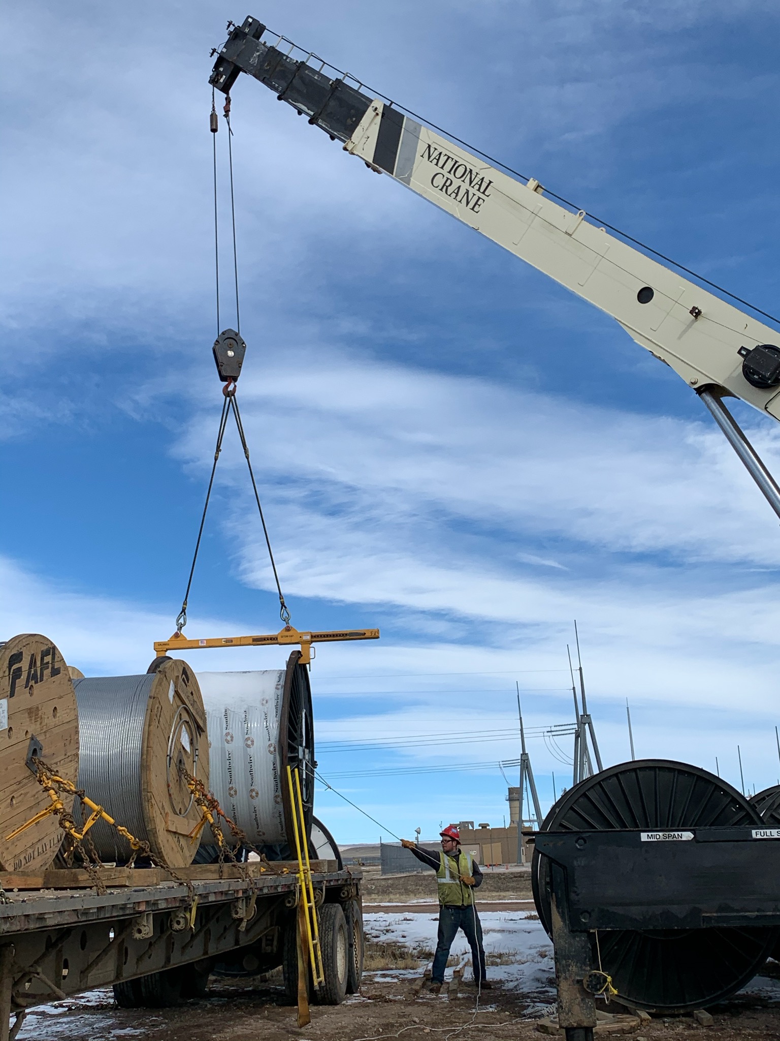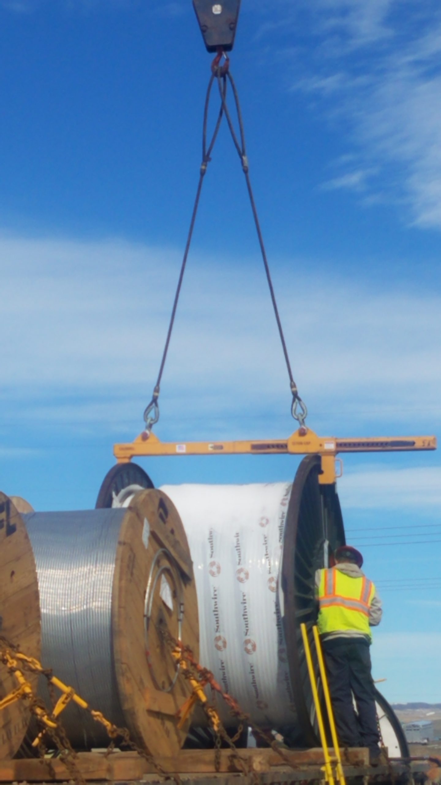 A 26,000-lb. (13-ton) capacity custom lifting beam from Caldwell is being used to lift reels of electrical cable off flatbed trailers.