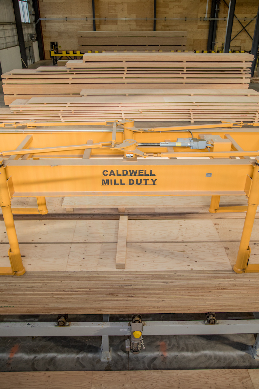 Freres Lumber Co. Inc. is using a custom below-the-hook attachment, manufactured by Caldwell, to lift long lumber loads at its Mass Ply Panel (MPP) facility in Lyons, Oregon.