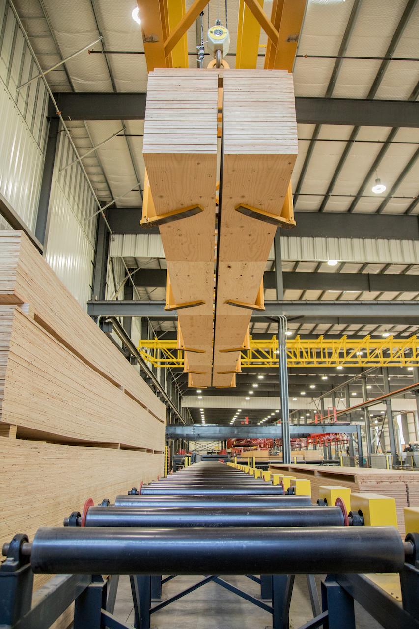 Caption: The 15-ton capacity, 53 ft.-long, motorized rotary leg lumber lifter handles lamellas (thin layers / plates) of structural composite lumber