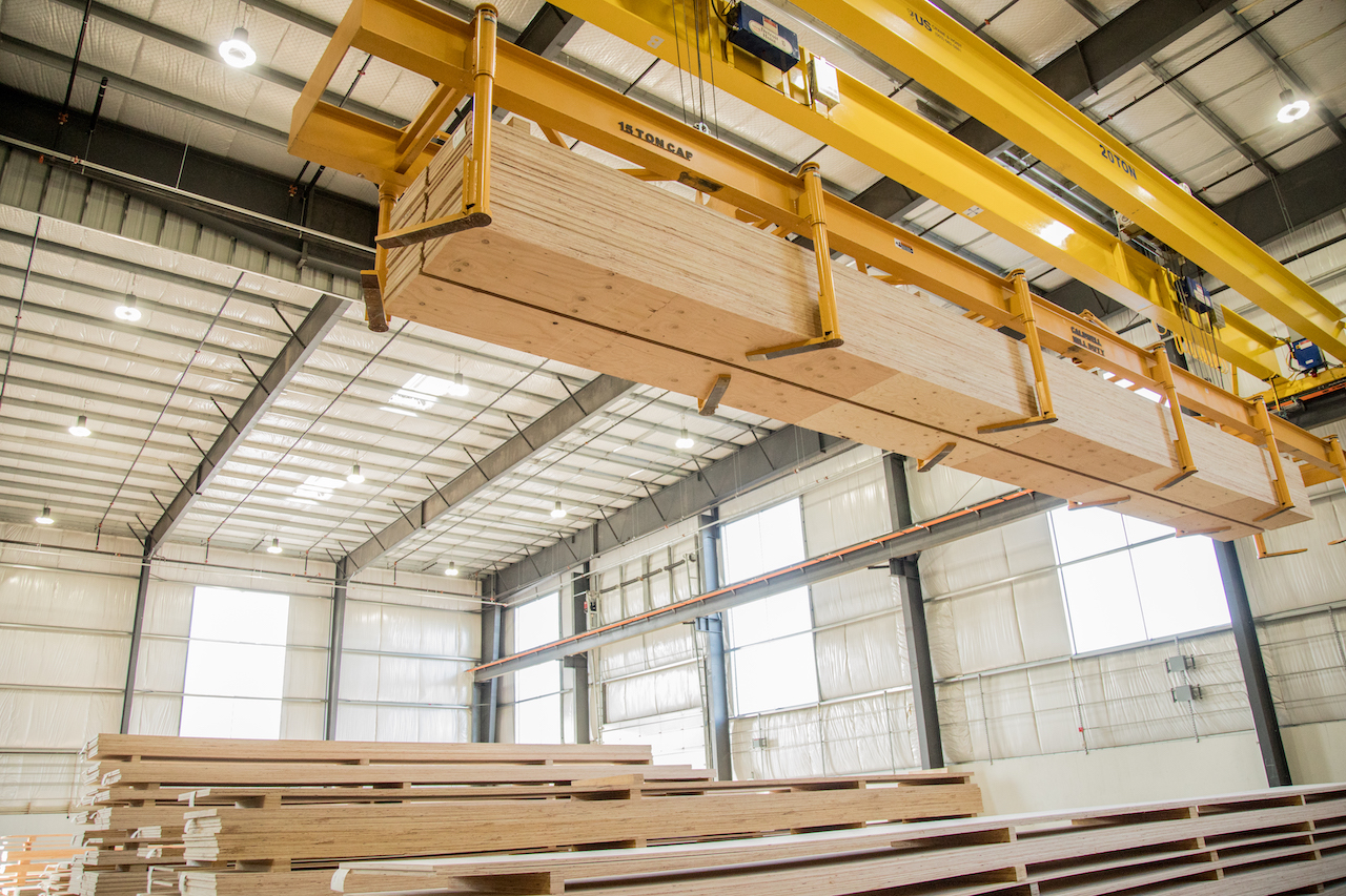 The 15-ton capacity, 53 ft.-long, motorized rotary leg lumber lifter handles lamellas (thin layers / plates) of structural composite lumber, used to manufacture MPP products. It is attached to a 20-ton capacity overhead crane with two hoists; the lifting equipment and attachment were provided by U.S. Crane & Hoist, also of Oregon (Wilsonville).