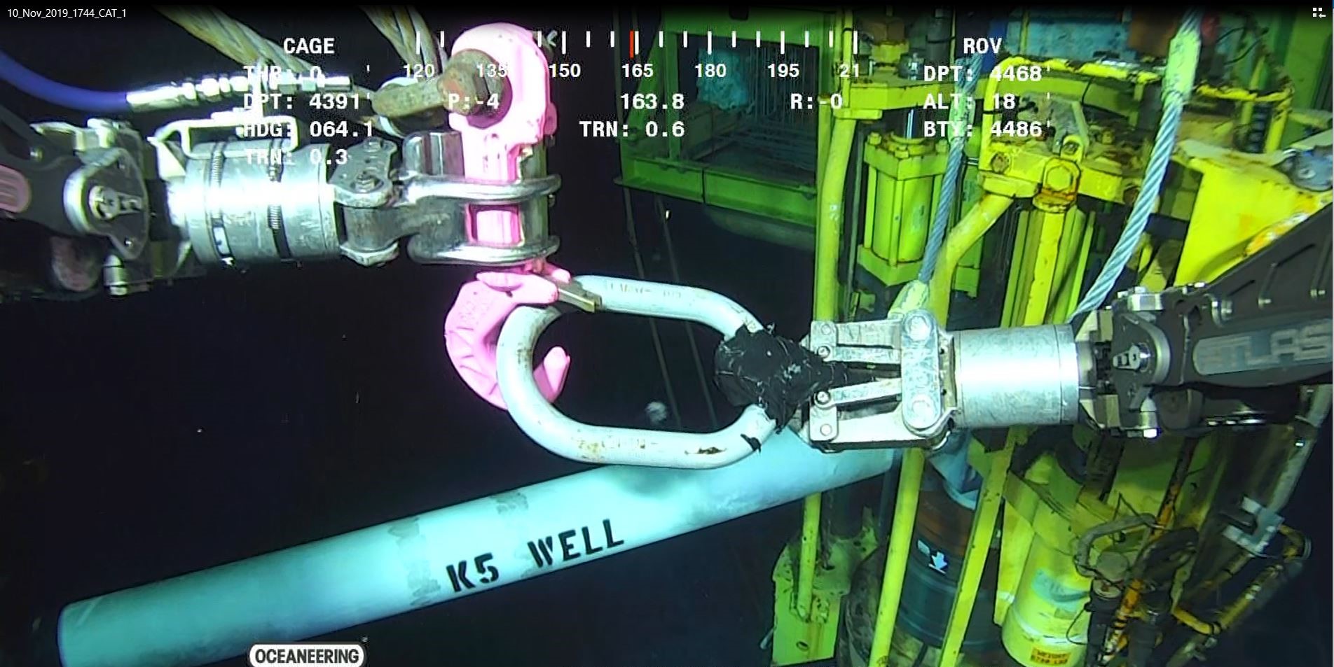 In a second contract for another major oil and gas company, the ROV hooks were again used to install a rigid M-shape jumper and associated subsea distribution hardware. Here, the hooks were used to make several smaller lifts of ancillary equipment and frames, weighing between 5,500 lbs. and 10,000 lbs., in support of the jumper installation using the 309 ft.-long MSV Cade Candies.