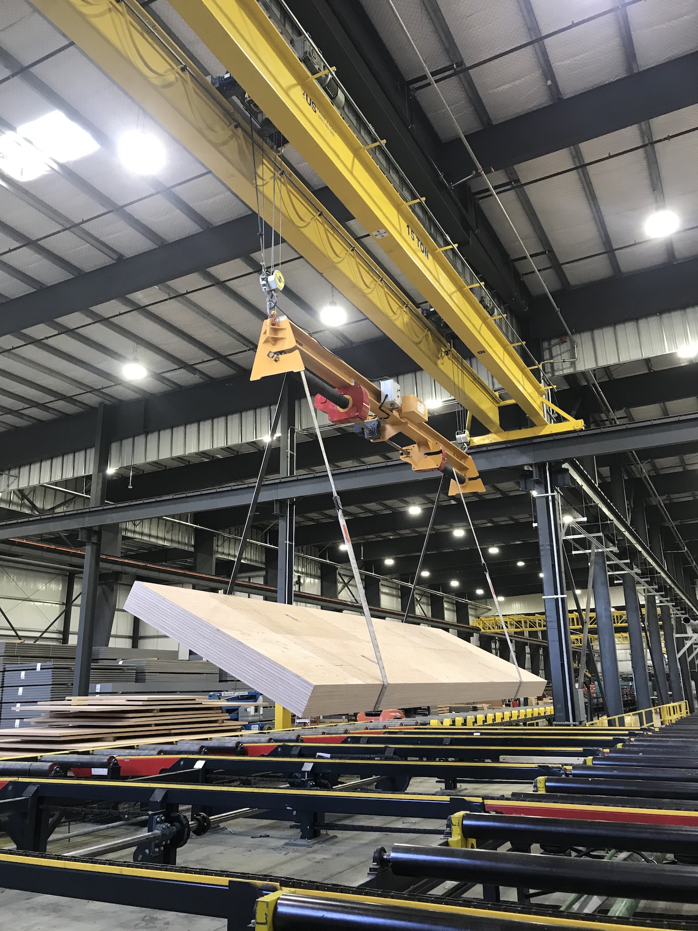The 180,000 sq. ft. facility (one of three Oregon locations) is serviced by seven overhead cranes, ranging in capacity from 5 tons to 15 tons, all provided by U.S. Crane & Hoist, also of Oregon. Some of them are fitted with two hoists and tandem lifts are commonplace at the world’s first veneer-based mass timber production facility.