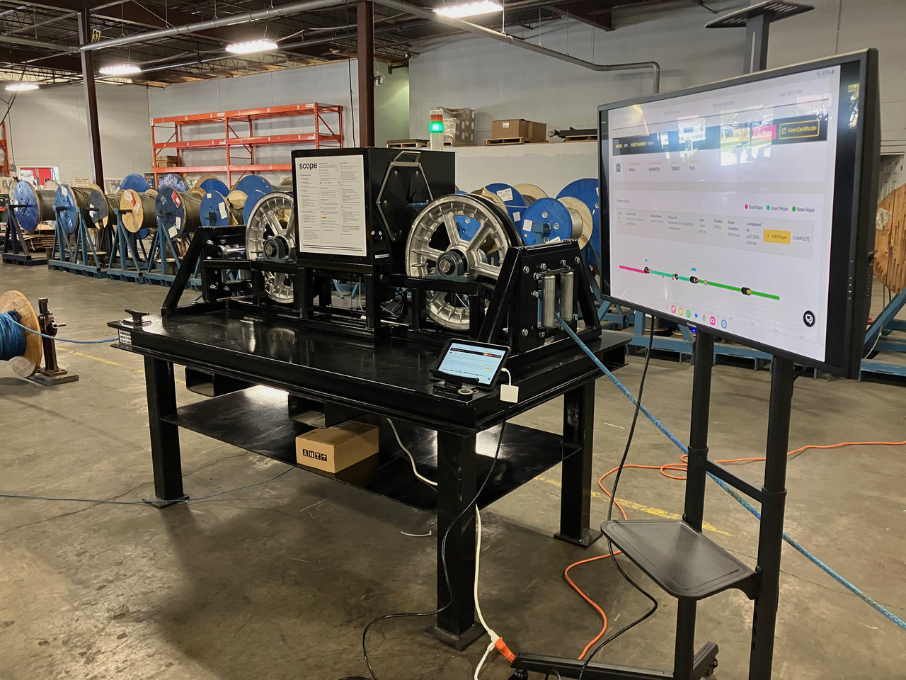 There are four major elements to the system: primary and repair scans; the inspection unit; and a tablet. Rope is spooled in through the Scope device while sensors detect damage and output a projected break strength per segment, and an inspection report is generated — made available to users online. The machine identifies areas of concern and a technician, trained in the inspection and repair of fiber ropes, can decide on remediation.