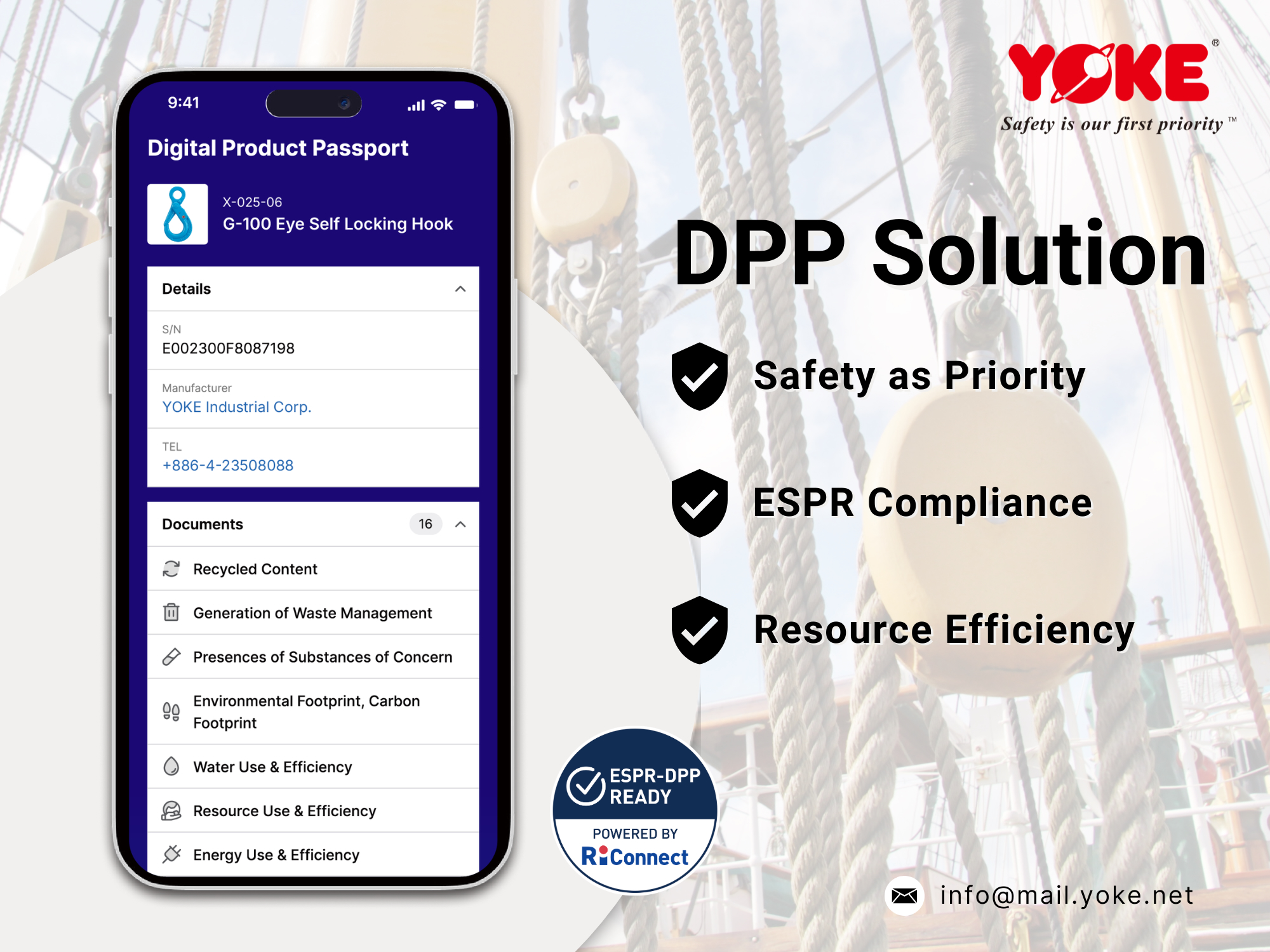 YOKE is committed to transforming compliance demands into business value, helping companies remain competitive in an ever-changing world. It is a manufacturer of Grade 80 and Grade 100 lifting chain fittings; swivel hoist hooks; shackles; angular contact swivels; wire rope clips; and lifting points. It also offers award-winning digital chips, which can be embedded directly into steel or retrofitted to snatch blocks and other products using tags. It’s partner company, RiConnect Inc., a provider of cloud-based Software as a Service (SaaS), supports this hardware with DPPs that securely record verified information across a product’s entire lifecycle.